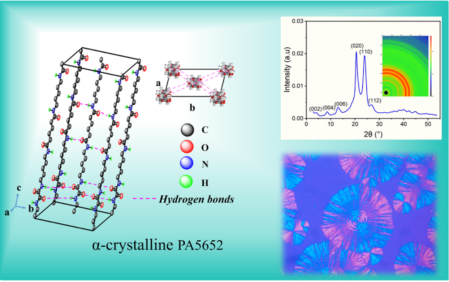貴大新聞網(wǎng)訊(材料與冶金學(xué)院)近日,我校材料與冶金學(xué)院劉玉飛特聘教授團(tuán)隊(duì)在生物基聚酰胺材料研究領(lǐng)域取得重要突破,相關(guān)成果以 Biobased Polyamide 5652 with α?Crystal Form: Characterization and Low Moisture Absorption為題,發(fā)表于高分子領(lǐng)域頂級期刊Macromolecules(自然指數(shù)期刊,中科院一區(qū)TOP)。貴州大學(xué)材料與冶金學(xué)院為論文第一完成單位,材料與冶金學(xué)院2022級碩士研究生王艷平為第一作者,劉玉飛特聘教授為通訊作者。近年來,生物基聚酰胺56(PA56)因其原料可再生、低碳環(huán)保而備受關(guān)注,但其特殊的分子結(jié)構(gòu)(戊二胺單元含奇數(shù)碳原子)導(dǎo)致其晶體通常以γ晶型為主,飽和吸水率高達(dá)12%以上,在潮濕環(huán)境中力學(xué)性能顯著下降(如拉伸強(qiáng)度降低20%-30%),嚴(yán)重限制了在精密工程領(lǐng)域的應(yīng)用,而傳統(tǒng)改性方法往往以犧牲材料其他性能為代價(jià)。針對這一難題,劉玉飛特聘教授創(chuàng)新性地提出了雙氫鍵結(jié)構(gòu)調(diào)控策略:自主合成關(guān)鍵單體,設(shè)計(jì)并成功合成新型565二胺單體(C16H34N4O2),將565二胺與草酸二丁酯通過溶液聚合及